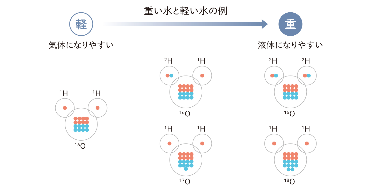 さまざまな同位体で構成された水分子の例。中性子(水色)の多い原子が含まれる水分子は重いため、気体になりにくく液体になりやすい。