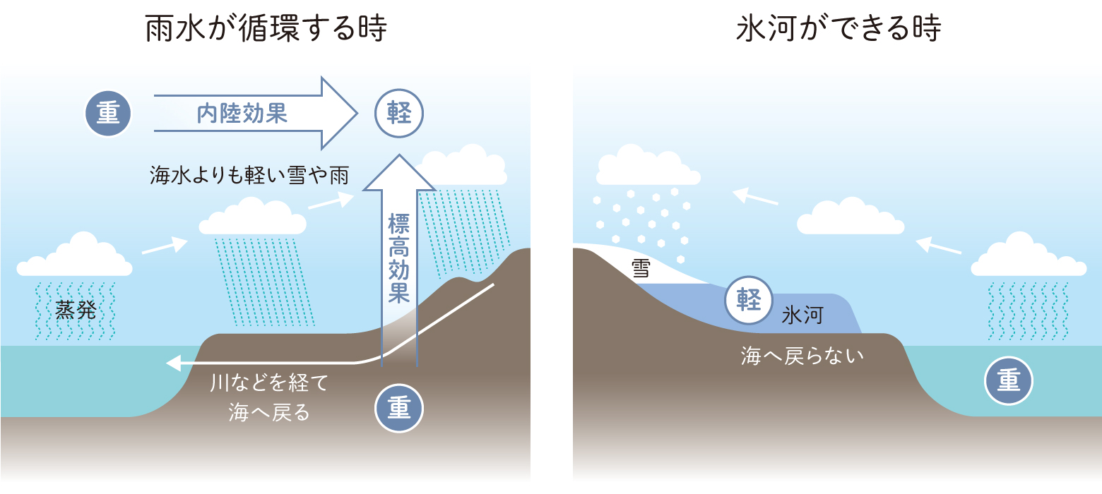 (左)海の水が蒸発してできた雲の水蒸気の分子は、海の水より軽いものが多くなる。さらに雨や雪の分子は内陸へ向かうほど、また標高が高くなるほど軽くなる(内陸効果・標高効果)。