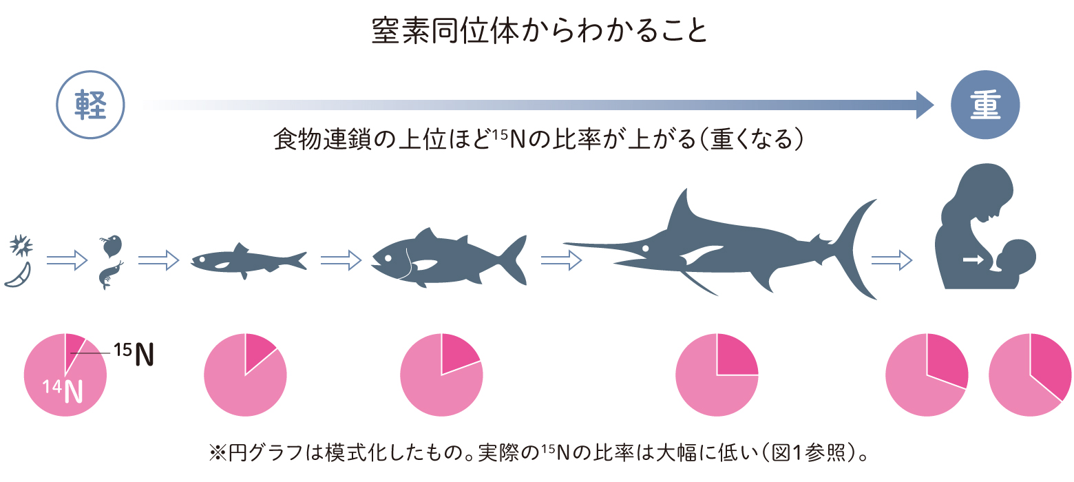 窒素の安定同位体(15N)の割合は捕食を通して大きく増加する(重くなる)ため、15Nからその生物の栄養段階を推測することができる。乳児は母乳を介してお母さんを「食べている」状態であるため、大人より重い窒素の割合が高い。