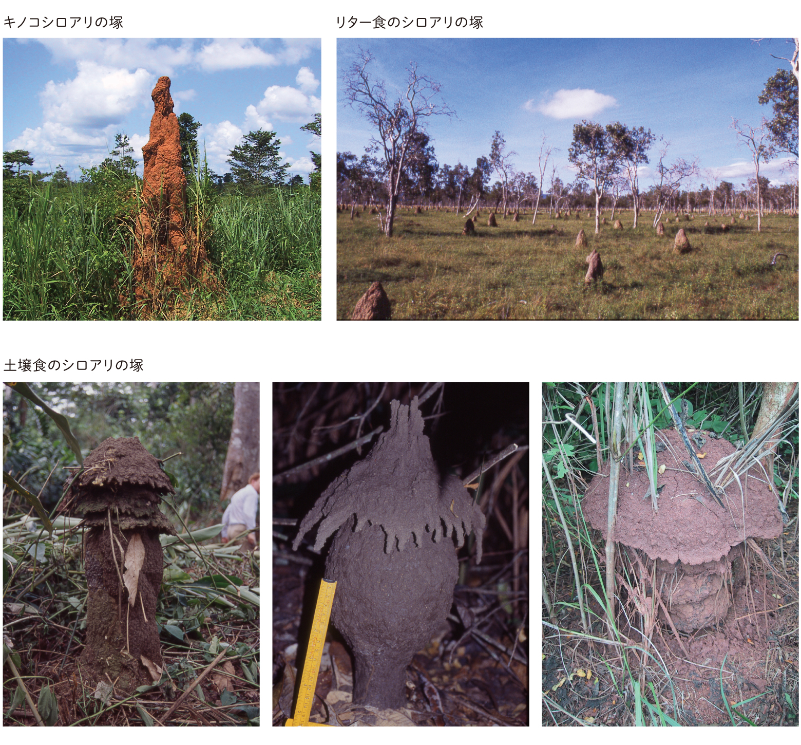 さまざまなシロアリのアリ塚。熱帯の大型土壌動物の総重量では1/3を超えることもあるシロアリは、細菌やきのこの力を助けに、堅い木材やリター(落葉や枯草などの植物遺体)、土壌までを餌にする。その糞とアリ塚の土は、微生物や植物に使いやすい資源となる。