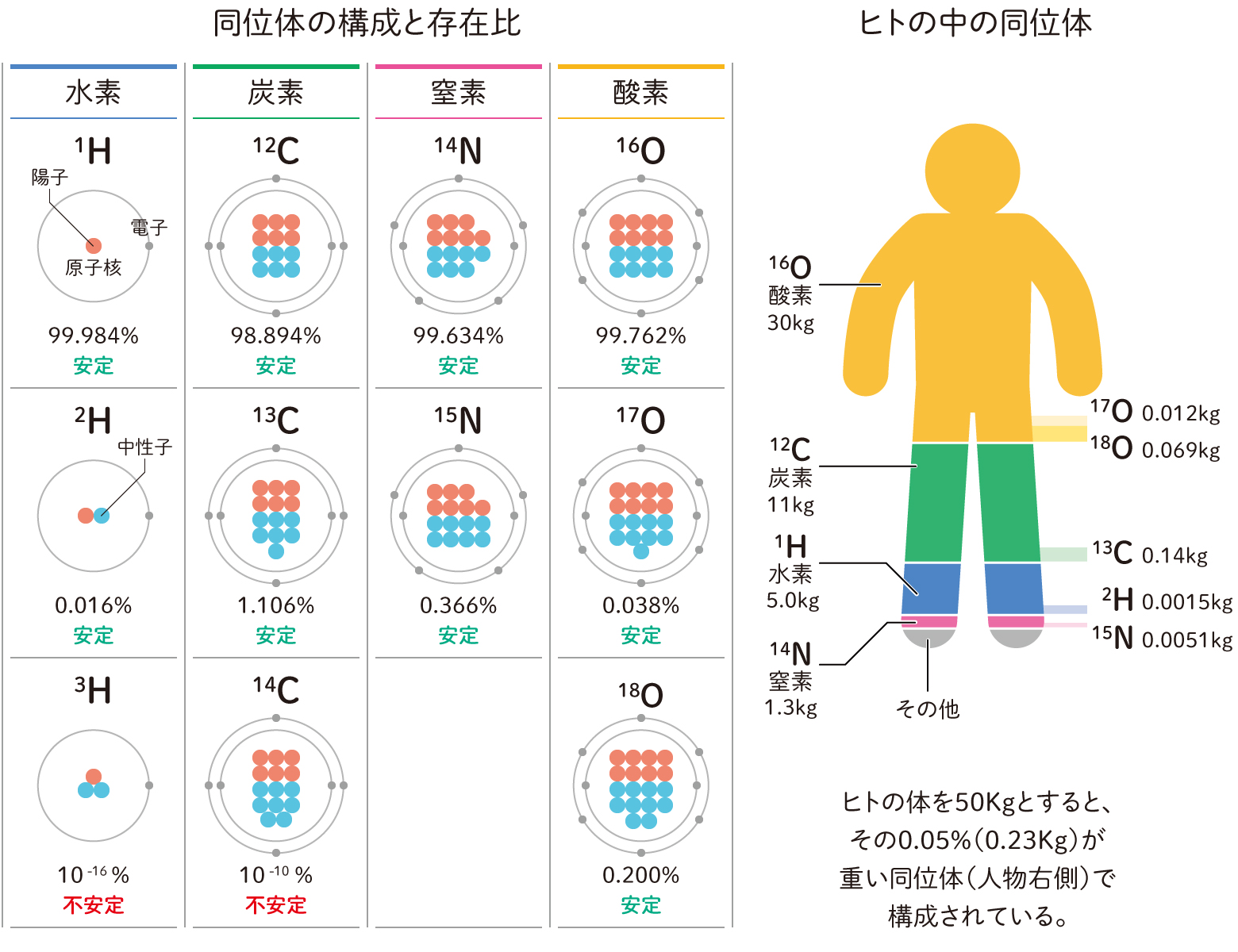 同じ元素でも中性子の数が異なる原子を同位体と呼ぶ。安定なものを「安定同位体」、不安定で弱い放射能を出しながら崩壊する原子を「放射性同位体」と呼ぶ。自然界には同位体が一定の比率で存在し、ヒトの体にも含まれている。