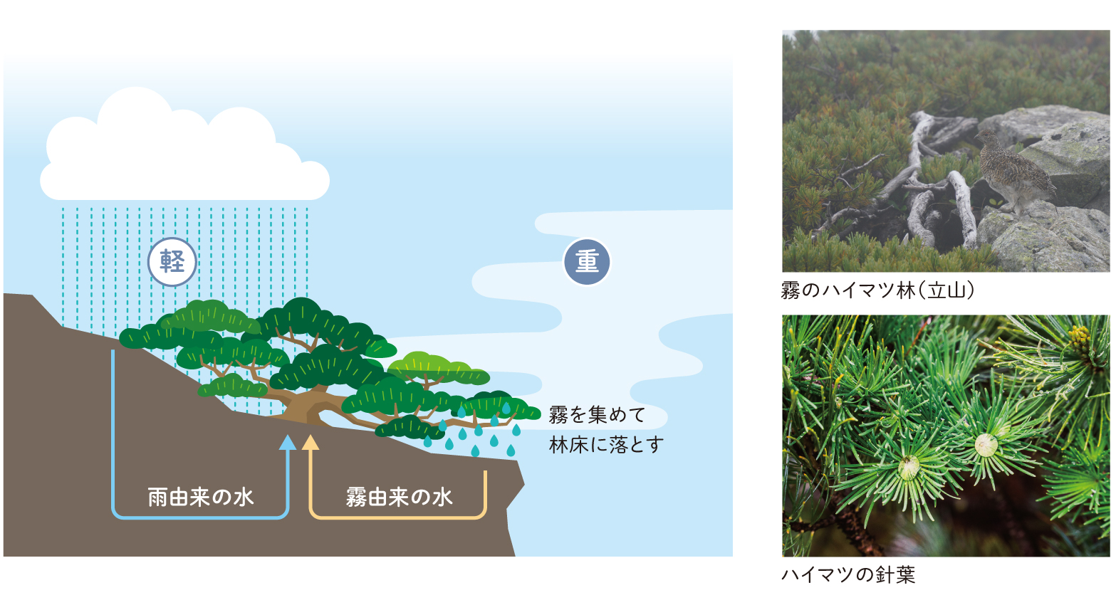 ハイマツが生息する高山は、水分を保持する土壌が発達していない。このような環境でハイマツはどのように水分を得ているのだろう。霧から直接とった水は、雨由来の水より重いことを利用して、林床に供給される水の由来を調査したところ、ハイマツは雨と霧の水分を両方利用しており、季節によっては林床に供給される水の半分が霧に由来することがわかった。(文献3)