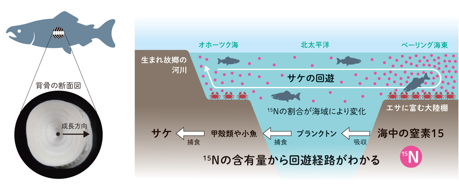 魚類の背骨は年輪のように内から外へ骨の成分が蓄積していくことで毎年成長する。骨の同位体比(15N/14N)を調べることで、幼魚から成魚になるまでの間の食物を知ることができる。特に15Nは海域ごとに特徴があり、サケがそれを反映した餌を食べることで回遊経路も推測できる。旅の記録が骨に刻まれているのだ。