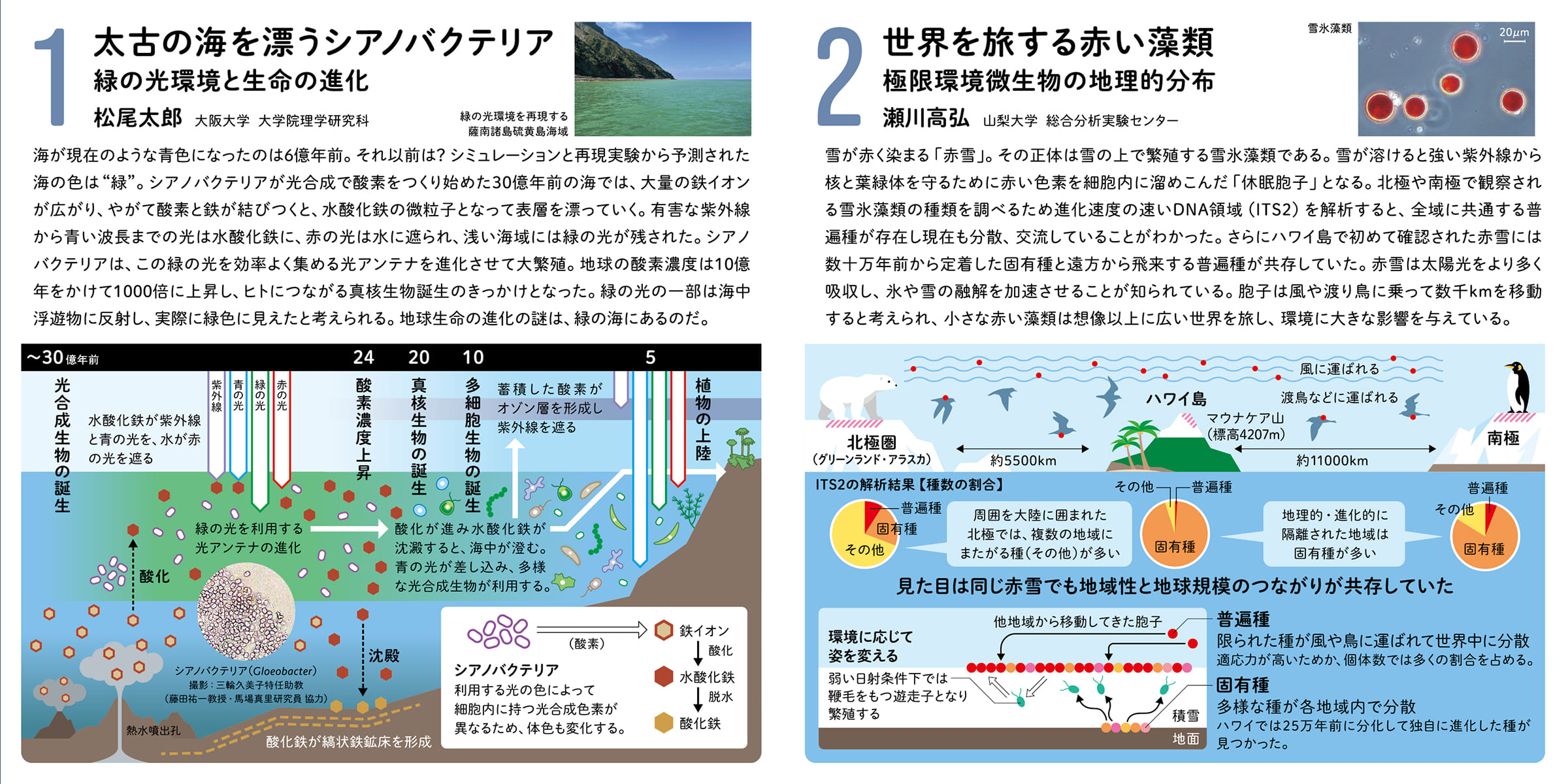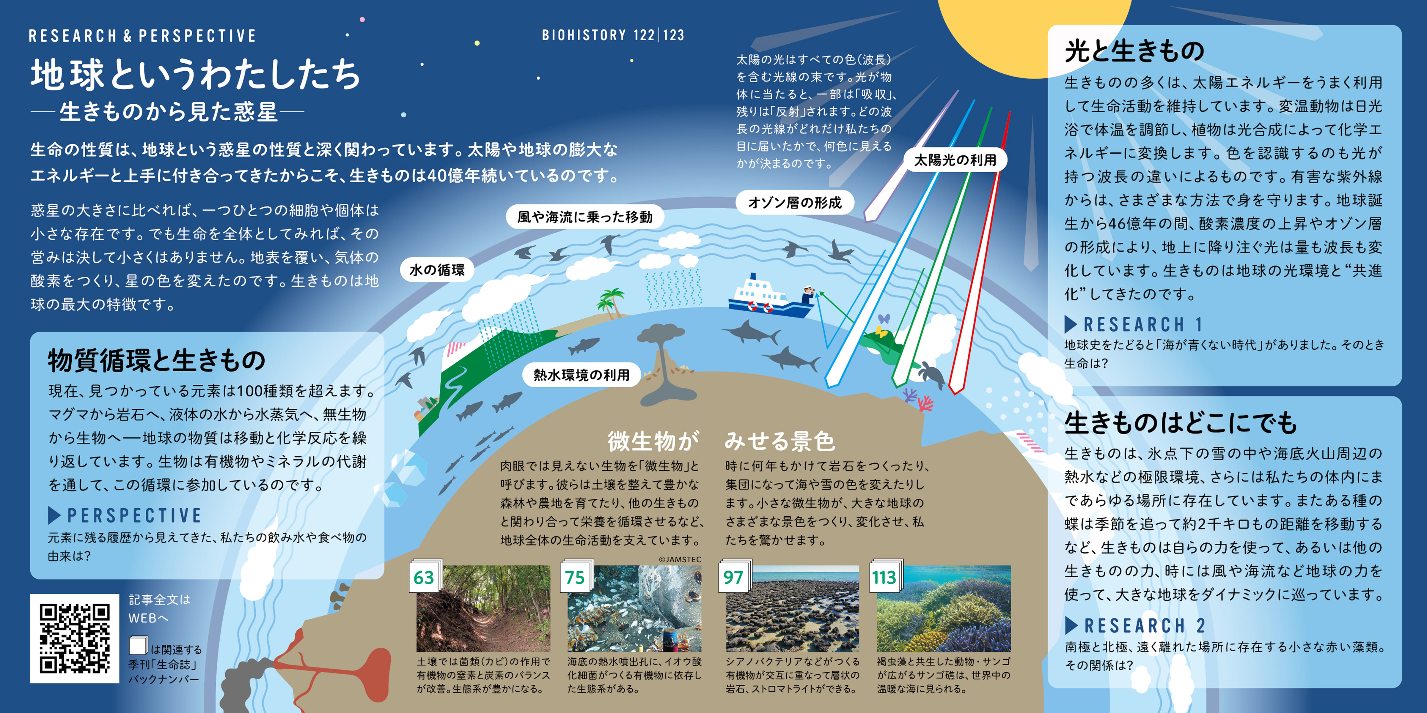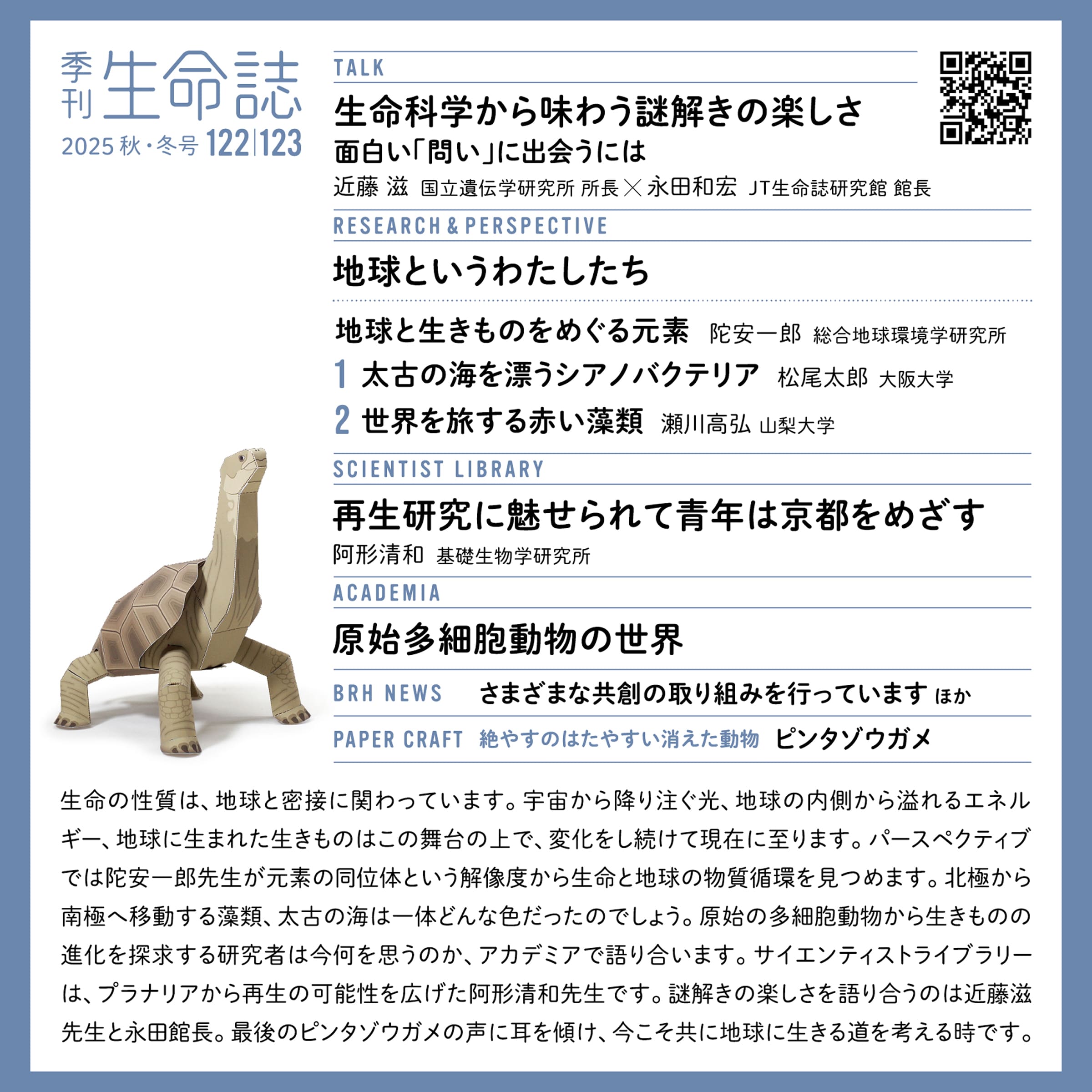 生命の性質は、地球と密接に関わっています。宇宙から降り注ぐ光、地球の内側から溢れるエネルギー、地球に生まれた生きものはこの舞台の上で、変化をし続けて現在に至ります。パースペクティブでは陀安一郎先生が元素の同位体という解像度から生命と地球の物質循環を見つめます。北極から南極へ移動する藻類、太古の海は一体どんな色だったのでしょう。原始の多細胞動物から生きものの進化を探求する研究者は今何を思うのか、アカデミアで語り合います。サイエンティストライブラリーは、プラナリアから再生の可能性を広げた阿形清和先生です。謎解きの楽しさを語り合うのは近藤滋先生と永田館長。最後のピンタゾウガメの声に耳を傾け、今こそ共に地球に生きる道を考える時です。