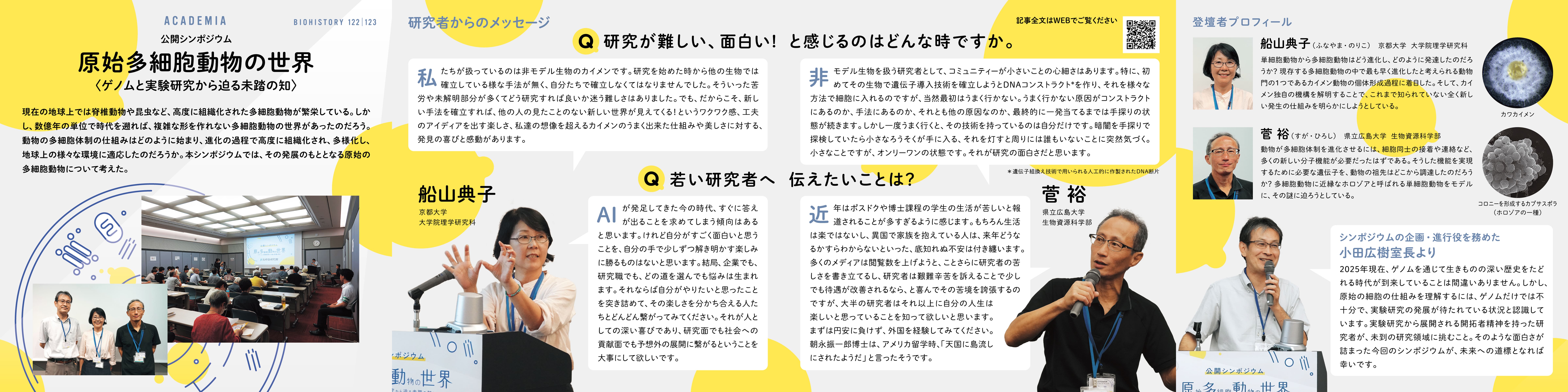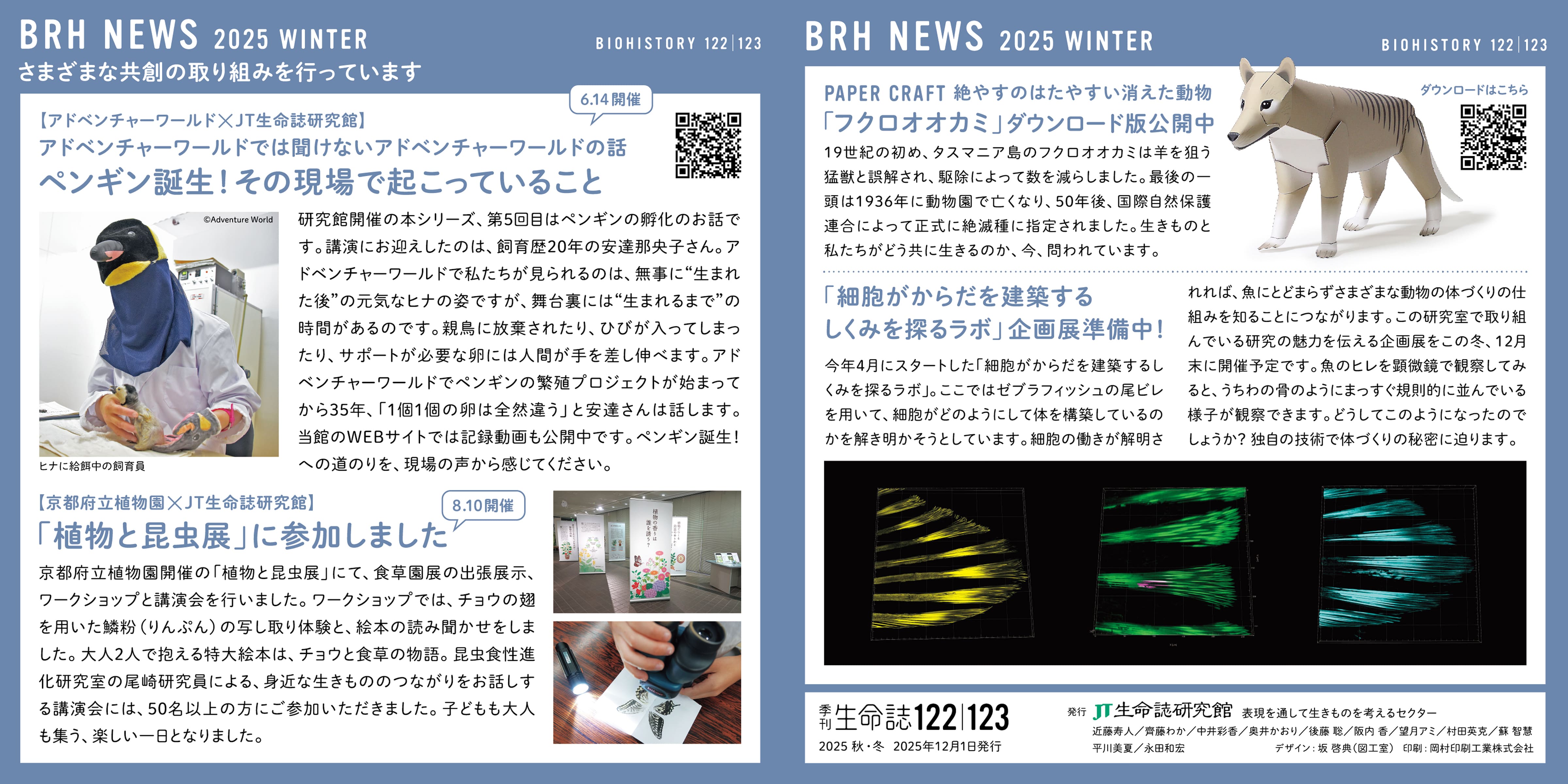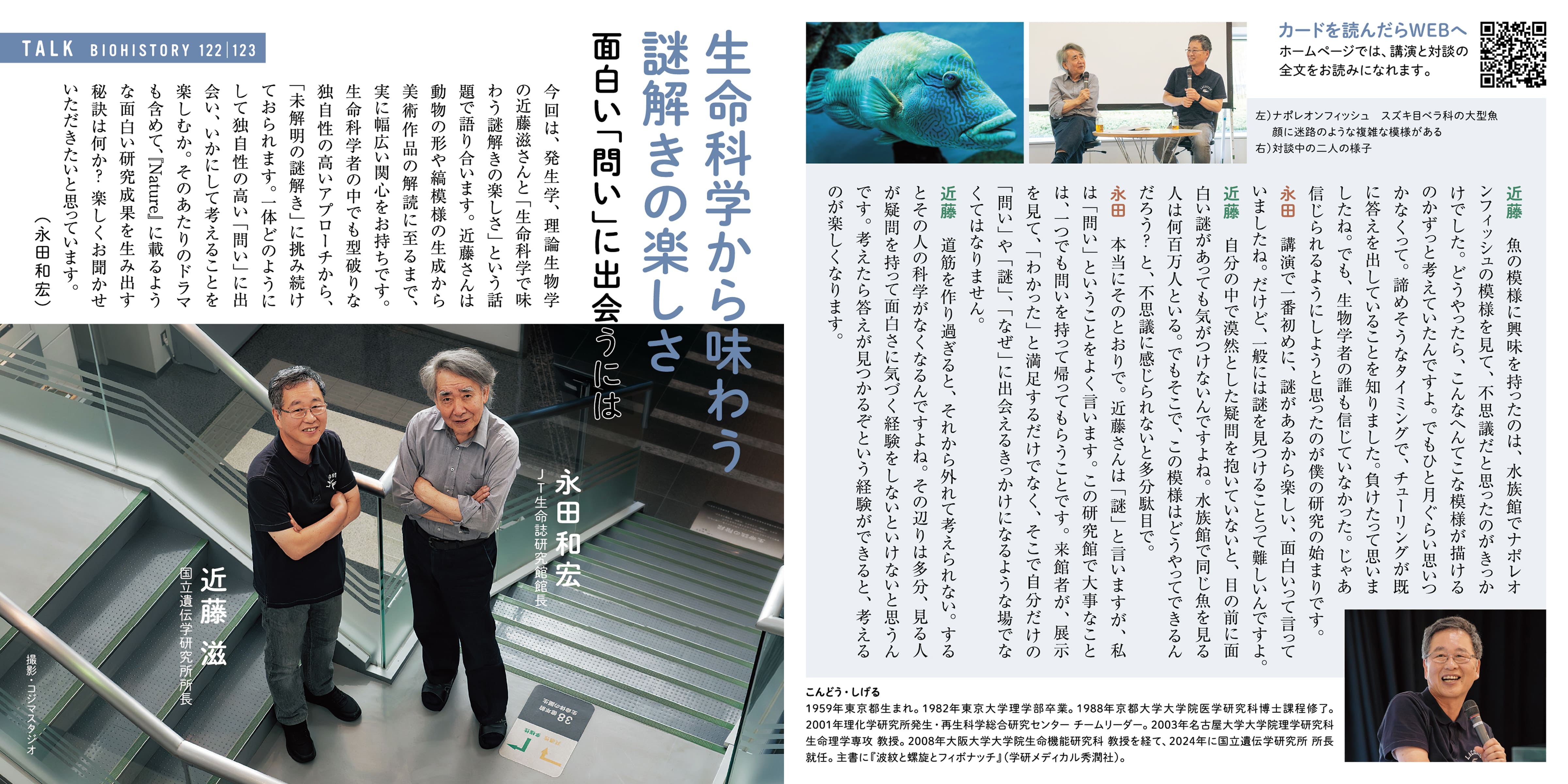 生命の性質は、地球と密接に関わっています。宇宙から降り注ぐ光、地球の内側から溢れるエネルギー、地球に生まれた生きものはこの舞台の上で、変化をし続けて現在に至ります。パースペクティブでは陀安一郎先生が元素の同位体という解像度から生命と地球の物質循環を見つめます。北極から南極へ移動する藻類、太古の海は一体どんな色だったのでしょう。原始の多細胞動物から生きものの進化を探求する研究者は今何を思うのか、アカデミアで語り合います。サイエンティストライブラリーは、プラナリアから再生の可能性を広げた阿形清和先生です。謎解きの楽しさを語り合うのは近藤滋先生と永田館長。最後のピンタゾウガメの声に耳を傾け、今こそ共に地球に生きる道を考える時です。