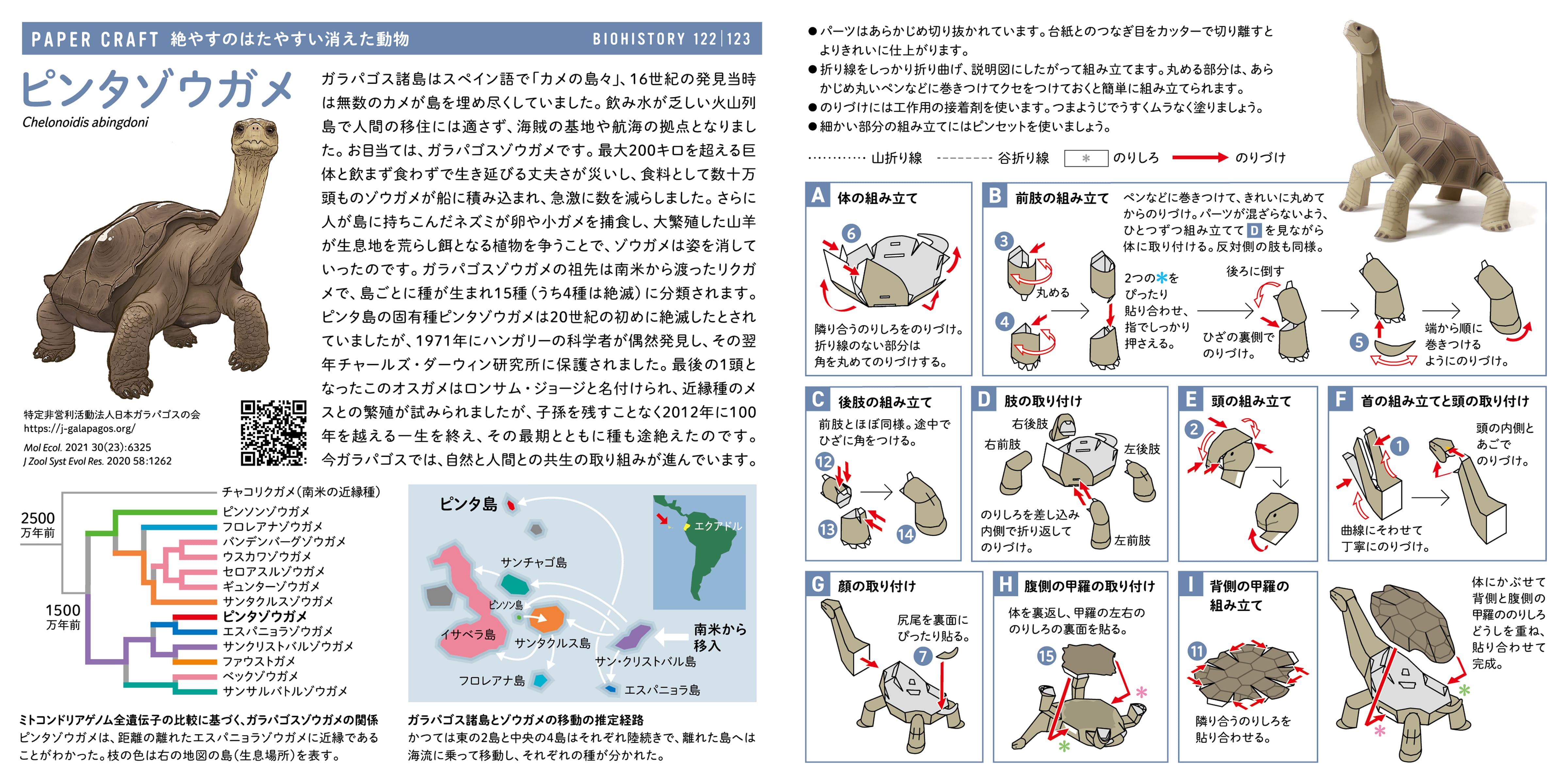 ピンタゾウガメは、ガラパゴス諸島ピンタ島の固有種のゾウガメで、2012年に飼育されていた最後の一頭「ロンサム・ジョージ」の死によって絶滅しました。最大200キロの巨体で飲まず食わずに耐えるので航海の食料として狩られ、家畜に棲家を荒らされ数を減らしました。島々では今、ゾウガメ再生の活動が進んでいます。