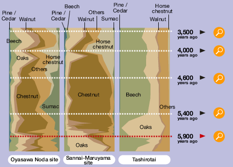 A comparison was made of the changes in the vegetation at the Oyasawa Noda site, which has traces of an eruption (early Jomon period) and Tashirotai at Mt. Hakkoda with information from Sannai-Maruyama to elucidate the relationship with cultural changes and with the ecology.