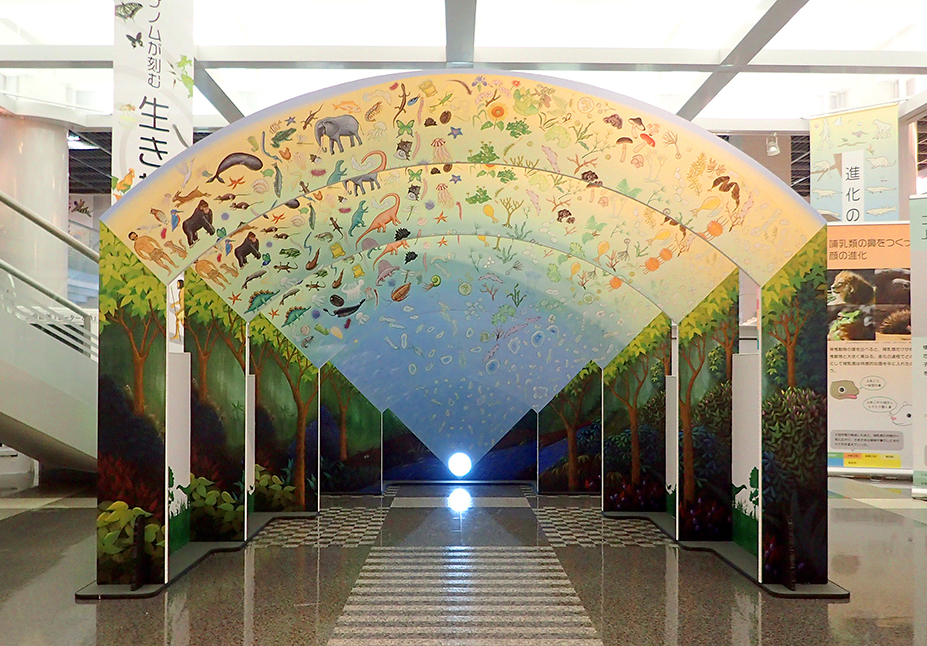 展示ホールに、入れるサイズの「生命誌絵巻」が登場します!絵巻に包まれて生きものの進化と広がりを感じ、その歴史を知ることができます。