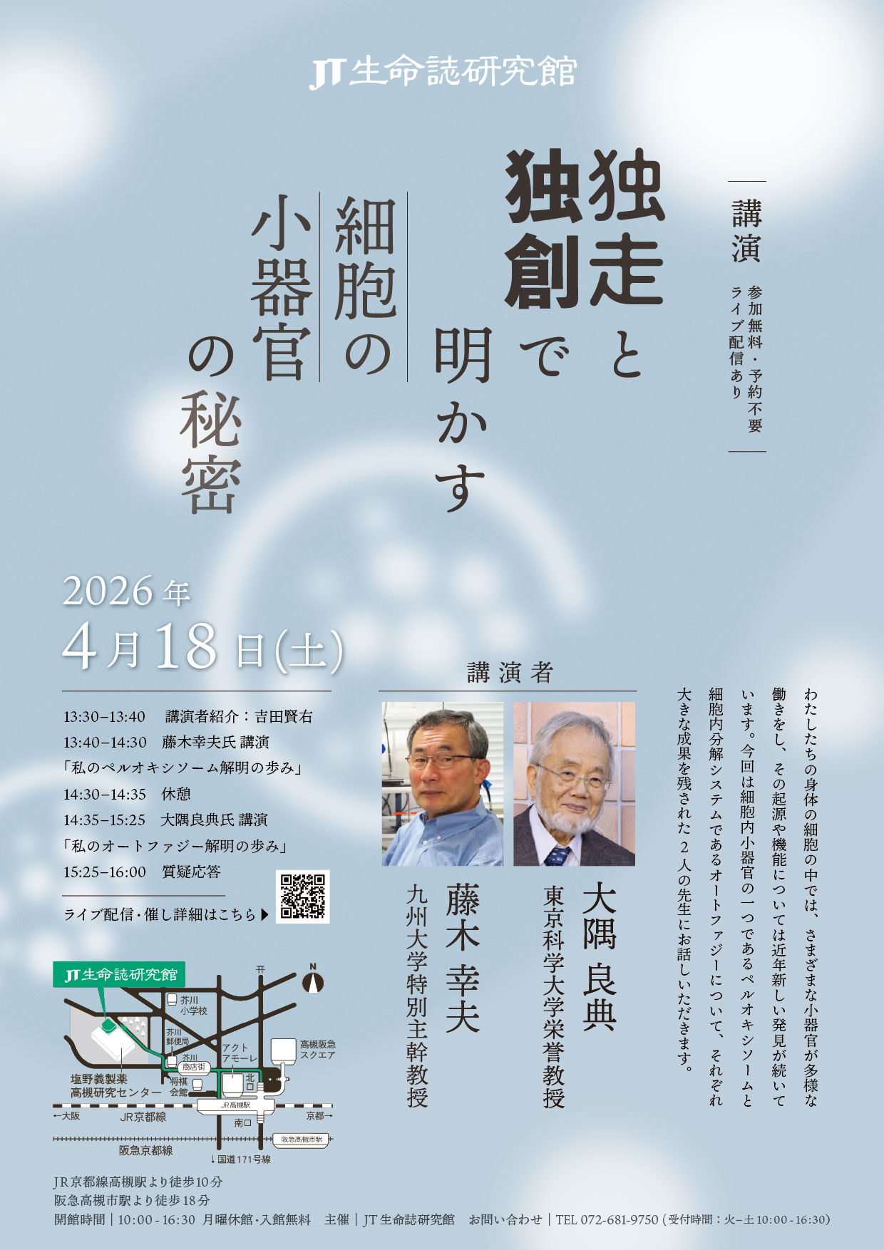 わたしたちの身体の細胞の中では、さまざまな小器官が多様な働きをし、その起源や機能については近年新しい発見が続いています。今回は細胞内小器官の一つであるペルオキシソームと細胞内分解システムであるオートファジーについて、それぞれ大きな成果を残された2人の先生にお話しいただきます。プログラム