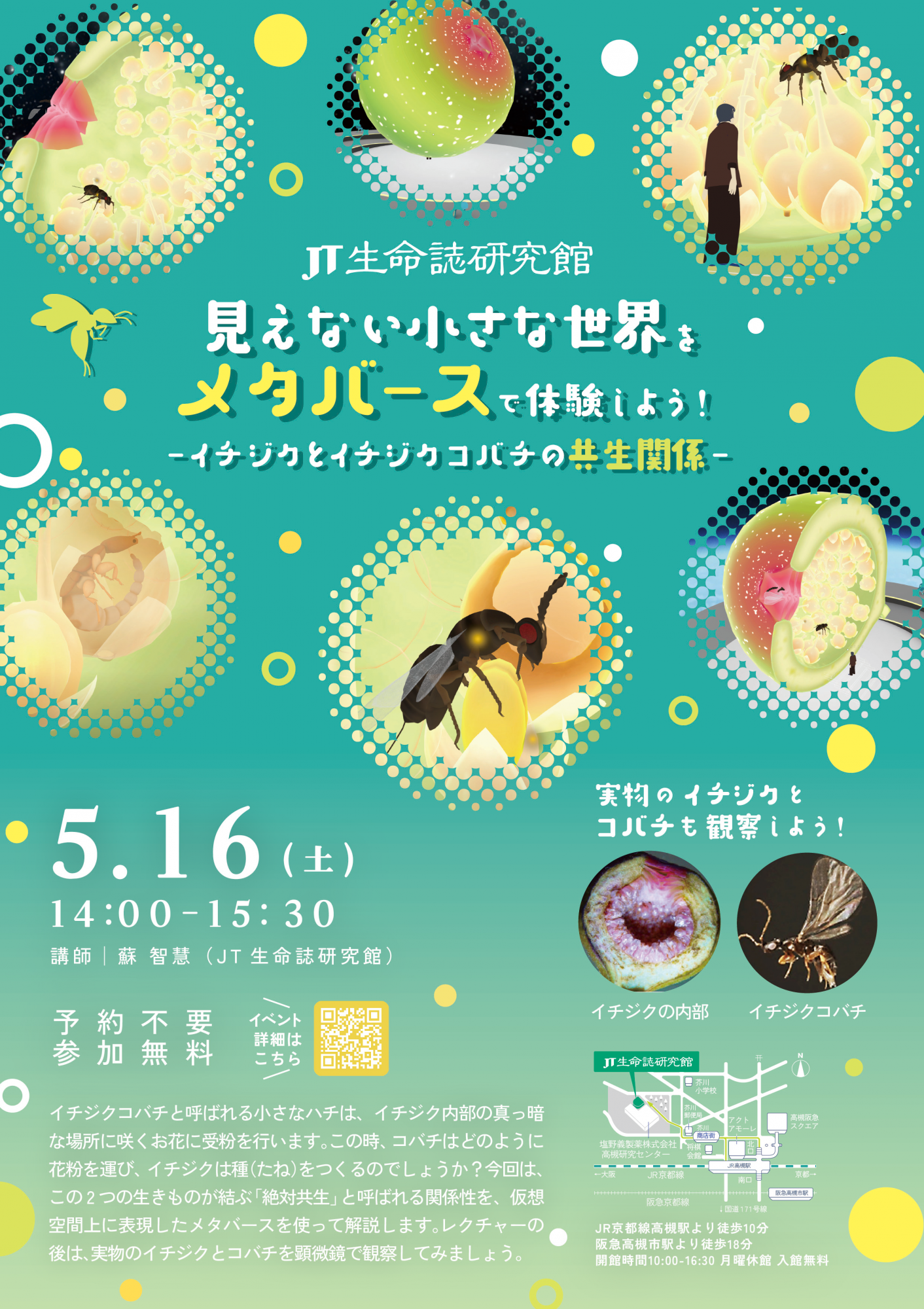 イチジクコバチと呼ばれる小さなハチは、イチジク内部の真っ暗な場所に咲くお花に受粉を行います。この時、コバチはどのように花粉を運び、イチジクは種(たね)をつくるのでしょうか?今回は、この2つの生きものが結ぶ「絶対共生」と呼ばれる関係性を、仮想空間上に表現したメタバースを使って解説します。レクチャーの後は、実物のイチジクとコバチを顕微鏡で観察してみましょう。