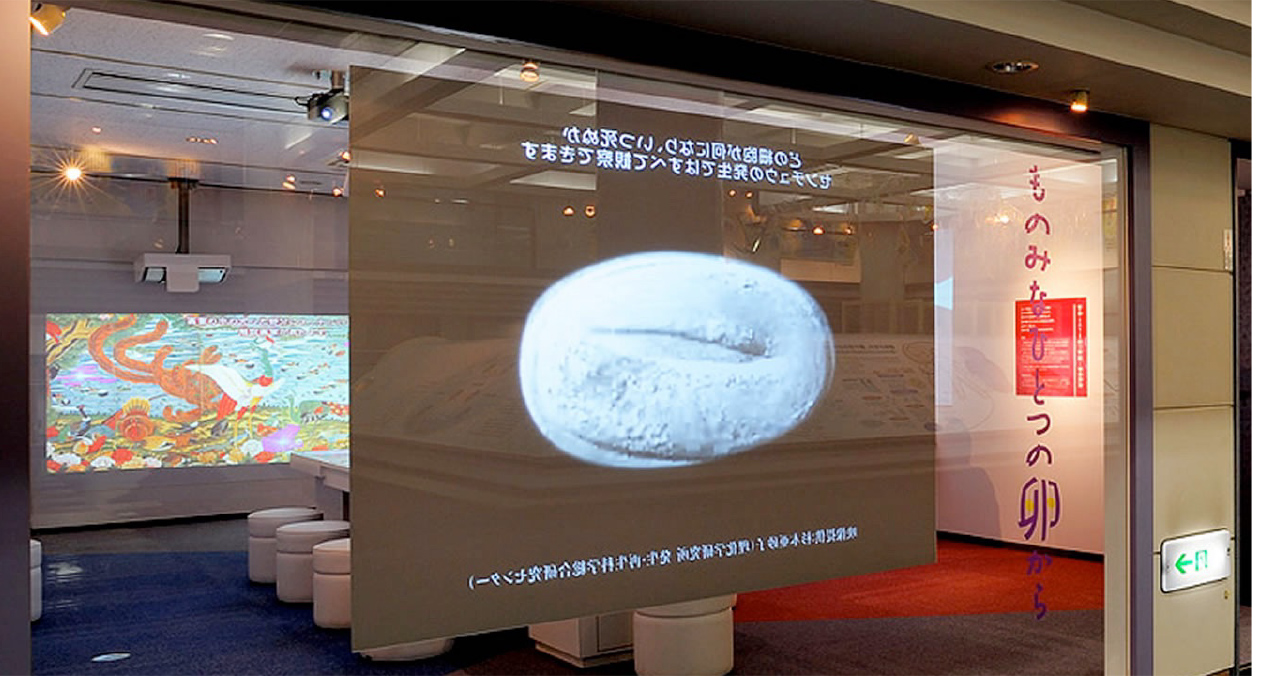 私たち多細胞生物の始まりはたった一つの細胞、受精卵です。カエルもチョウもサカナもヒトもそれぞれの発生の時間を経て、からだの形がつくられ、生まれ、世界に飛び出します。部屋の中央のパネルには実物の卵を集め、まわりの壁にはパズルや仕かけと組み合わせて発生と進化を考える映像を流しています。生きものがみなたどる発生というプロセスに注目し、実物や映像を交えながら環境との関わりの中でからだづくりを柔軟に変化させてきた進化について考える展示です。