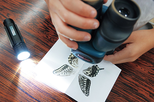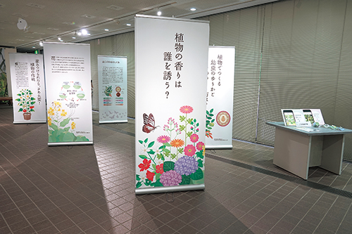 京都府立植物園開催の「植物と昆虫展」にて、食草園展の出張展示、ワークショップと講演会を行いました。ワークショップでは、チョウの翅 を用いた鱗粉(りんぷん)の写し取り体験と、絵本の読み聞かせをしま した。大人2人で抱える特大絵本は、チョウと食草の物語。昆虫食性進化研究室の尾崎研究員による、身近な生きもののつながりをお話しする講演会には、50名以上の方にご参加いただきました。子どもも大人も集う、楽しい一日となりました。