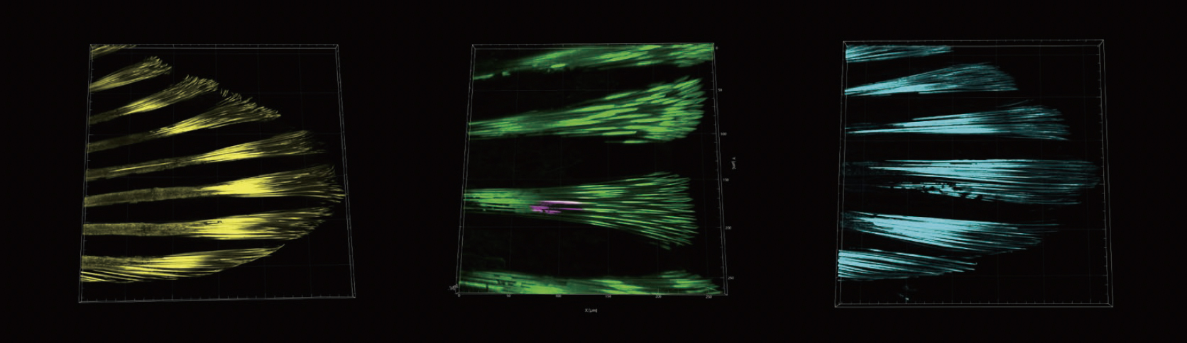 今年4月にスタートした「細胞がからだを建築するしくみを探るラボ」。ここではゼブラフィッシュの尾ビレを用いて、細胞がどのようにして体を構築しているのかを解き明かそうとしています。細胞の働きが解明されれば、魚にとどまらずさまざまな動物の体づくりの仕組みを知ることにつながります。この研究室で取り組んでいる研究の魅力を伝える企画展をこの冬、12月末に開催予定です。魚のヒレを顕微鏡で観察してみると、うちわの骨のようにまっすぐ規則的に並んでいる 様子が観察できます。どうしてこのようになったので しょうか? 独自の技術で体づくりの秘密に迫ります。 お見逃しなく!