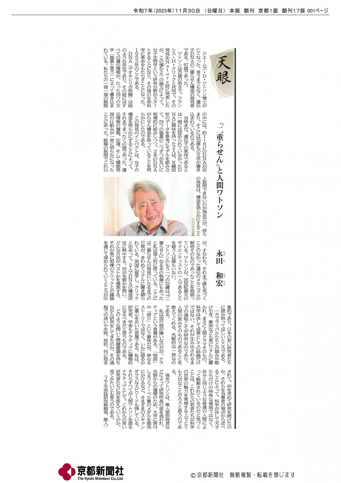 3. 「『二重らせん』と人間ワトソン」永田館長 京都新聞掲載記事(★許可を得て転載)