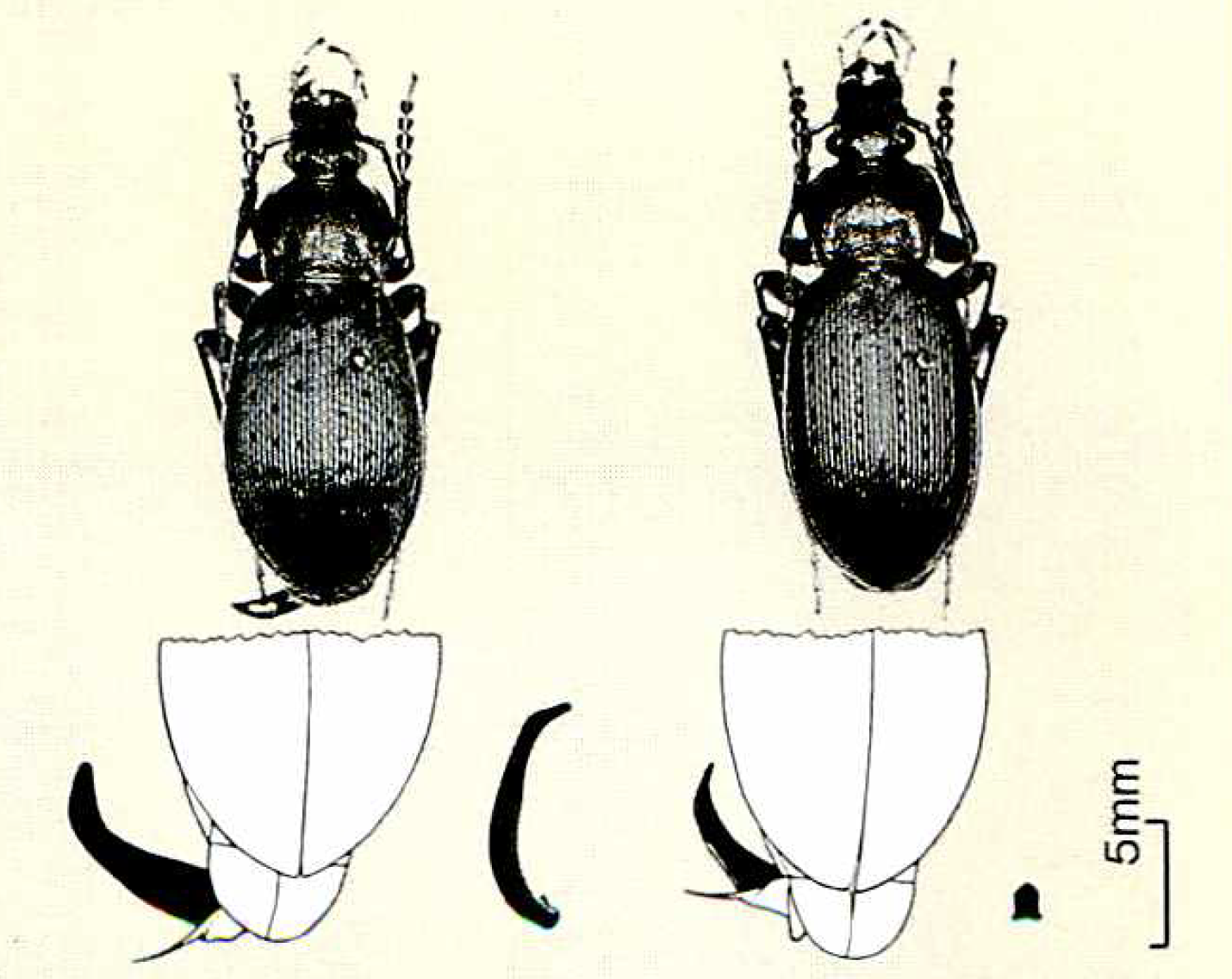図6:ヤコンサオムシ(右)の雄とドウキョウオサムシ(左)の雄。外形はそっくりなのに、ペニスと交尾片はこんなに違う