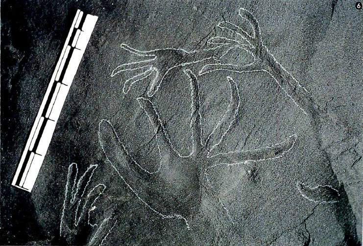 近くからは、両生類と思われる足跡や、水かきのない水辺の烏(チドリやシギ、サギのような)の足跡も見つかっている。くちばしを沼に差し込んでエサをとった跡(採餌痕)もあった。すでに中国ではジュラ紀の鳥類化石が見つかっており、この恐竜繁栄の時代に、すでに始祖鳥とは別の本格的な鳥類が同居していたのである。