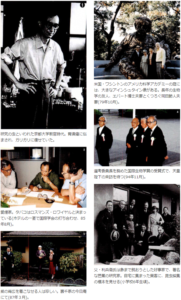 生命誌研究館の岡田節人館長が、1995年度の文化功労者に選ばれた。岡田館長といえば、その独特のファッション・センスでその名を天下(?)に知られる生物学者。実家は350年続いた伊丹(兵庫県)の造り酒屋。代々京都から嫁を迎える家柄で、摂津の商人文化と京都の公家文化の奇妙なアマルガムのなかで育つ。真っ赤なアルファ・ロメオから現在のグリーンのシトロエンまで、さっそうと外車を乗り回し、鉄道マニアで昆虫大好きの一大趣味人。イギリス現代音楽を中心とした音楽の造詣の深さには、専門家も舌をまく。さて、トキンド・オカダの正体はいかに。