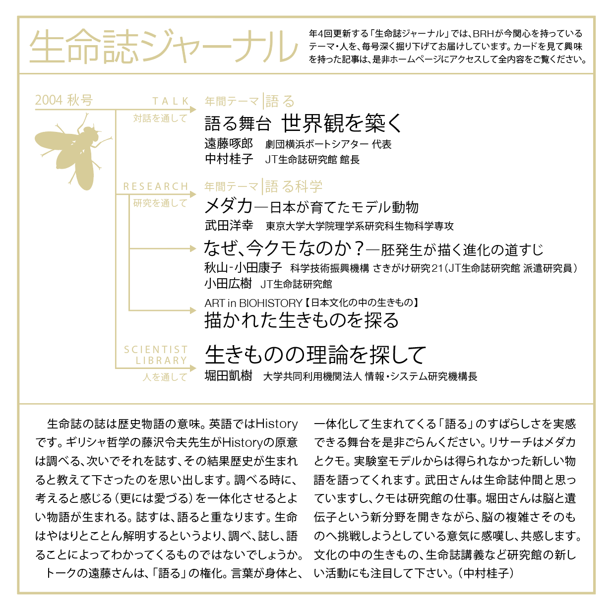 トークの遠藤さんは、「語る」の権化。言葉が身体と、一体化して生まれてくる「語る」のすばらしさを実感できる舞台を是非ごらんください。リサーチはメダカとクモ。実験室モデルからは得られなかった新しい物語を語ってくれます。武田さんは生命誌仲間と思っていますし、クモは研究館の仕事。堀田さんは脳と遺伝子という新分野を開きながら、脳の複雑さそのものへ挑戦しようとしている意気に感嘆し、共感します。文化の中の生きもの、生命誌講義など研究館の新しい活動にも注目して下さい。(中村桂子)
