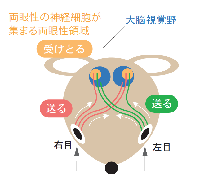 両目からの視覚情報の一部は、大脳の視覚野の両眼性領域(視覚野の1/3程度)へ運ばれる。