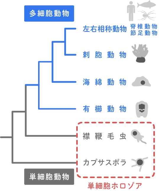 *単細胞ホロゾア…多細胞動物に近縁な単細胞動物。襟鞭毛虫やカプサスポラを含む(下図参照)。