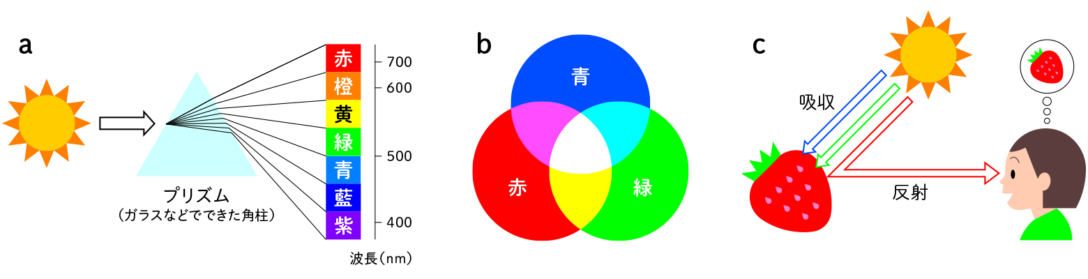 では、赤を赤と感じるしくみはどのようなものなのでしょうか?例えば、一粒のイチゴがあるとします。光源から出た3色の光がイチゴに当たると、緑と青の光を「吸収」し、赤の光を「反射」します。「吸収」というのは化学的な言い回しですが、イチゴが光エネルギーを受け取る反応であることをふまえるとイメージしやすいのではないでしょうか。そして、「反射」した光は目の奥にある網膜に届くと、視細胞を刺激し、電気信号として視神経を通じて脳に伝わります。こうして私たちは、「赤いイチゴ」を知覚するのです(図2c)。この視細胞には3種類あり、それぞれが光の三原色の波長に対応し、電気信号の強さと混ざり具合によって様々な色を作り出すことができます。以降本稿では、「赤の光」は「赤い波長の光」、「赤色」は「赤く見えること」を表すことにします。