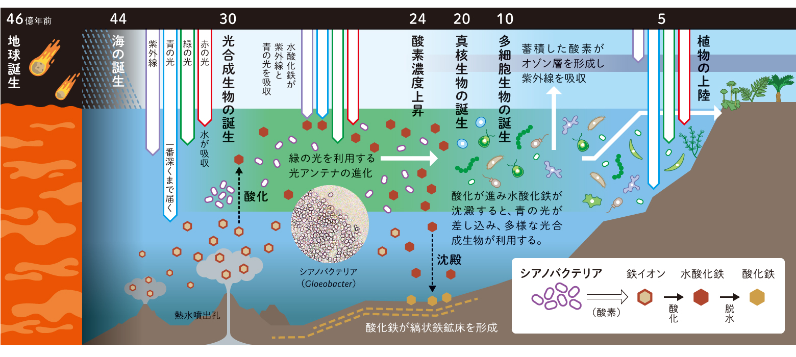 それでは、46億年前に話を移しましょう。図3に照らしながら、地球と生命の始まりを見ていきます。誕生間もない地球では、1500度を超えるマグマの海が広がっていました。分厚い雲が立ち込め、太陽の光はほとんど届きません。その後温度が下がると、1000年近く雨が降り続き、原始の海ができあがります。海底の熱水域からは、活発な火山活動により大量の鉄イオンが溶け出していました。雲が晴れ太陽の光が海に差し込むようになると、光の三原色のうち、赤の光、緑の光の順で水に吸収され、青の光が海底まで届き反射します。つまり、当時の海は青色に見えたはずです。そして約40億年前、熱水噴出孔もしくは間欠泉(一定周期で噴出する水蒸気や熱水)の近くで、有機物の集まりの中から最初の生命が誕生します。この時代はオゾン層がないため、生体に有害な紫外線は遮られることなく海上に降り注ぎ、酸素もまだありません。その後10億年の間に光合成能力をもつ生物(シアノバクテリアの姉妹種など)が現れ、水から酸素をつくり始めます。紫外線の届かない水深で、青の光を使っていたのでしょう。鉄イオンは、酸素と結びついて水酸化鉄となり表層を漂います。この水酸化鉄は、不溶性の微粒子で、紫外線と青の光をよく吸収します。赤の光は浅い海域で水に吸収されるので、海中には緑の光が残されることになります。実際に、水酸化鉄の濃度分布を計算すると、この緑の光環境が再現されたのです。詳細は後述しますが、シアノバクテリアは、この光環境に合わせて緑の光を効率よく使えるように進化したと考えられます。そして、緑の光の一部は、水酸化鉄に反射し、実際に海は緑色に見えていたのではないか、というのが私たちの仮説です。これは、「海中が緑の光で満たされたこと」と「海面が緑色に見えること」という2つの意味で、“緑の海仮説”と呼ばれています。