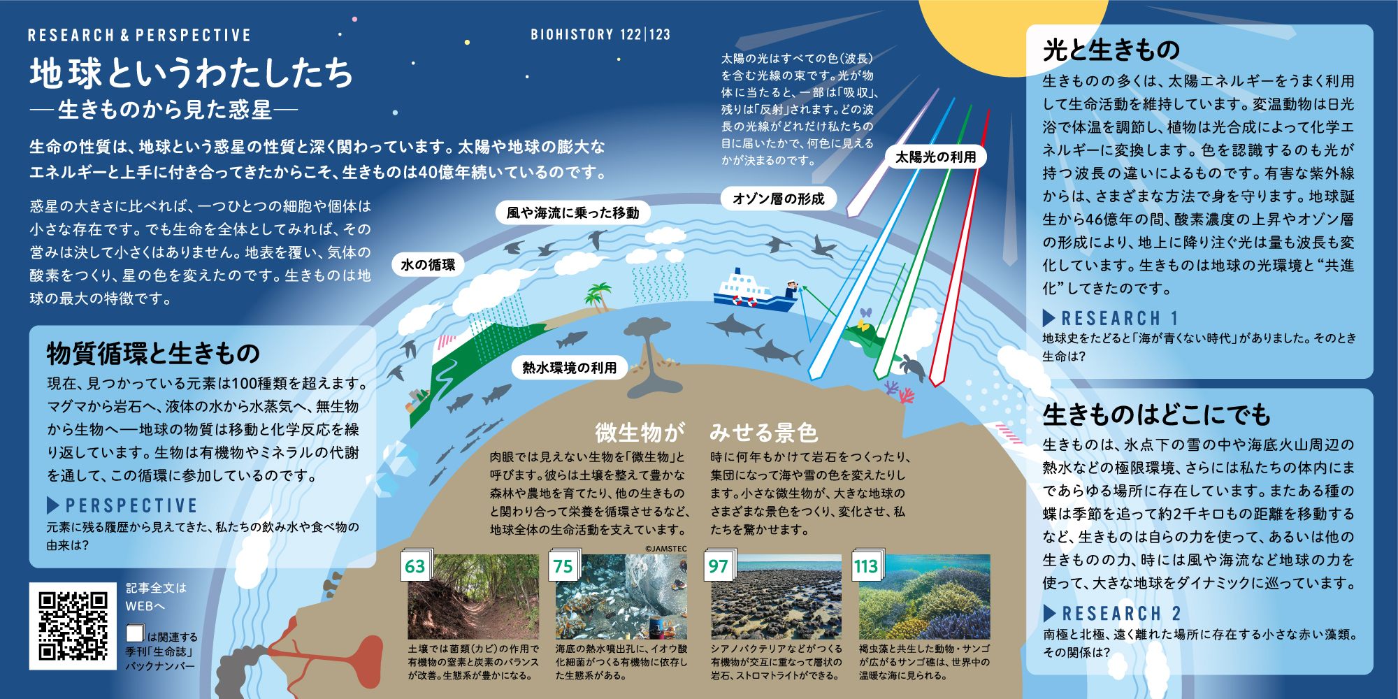 生命の性質は、地球という惑星の性質と深く関わっています。太陽や地球の膨大なエネルギーと上手に付き合ってきたからこそ、生きものは40億年続いてきました。惑星の大きさに比べれば、一つひとつの細胞や個体は小さな存在です。でも生命を全体としてみれば、その営みは決して小さくはありません。地表を覆い、気体の酸素をつくり、星の色を変えたのです。生きものは地球の最大の特徴です。