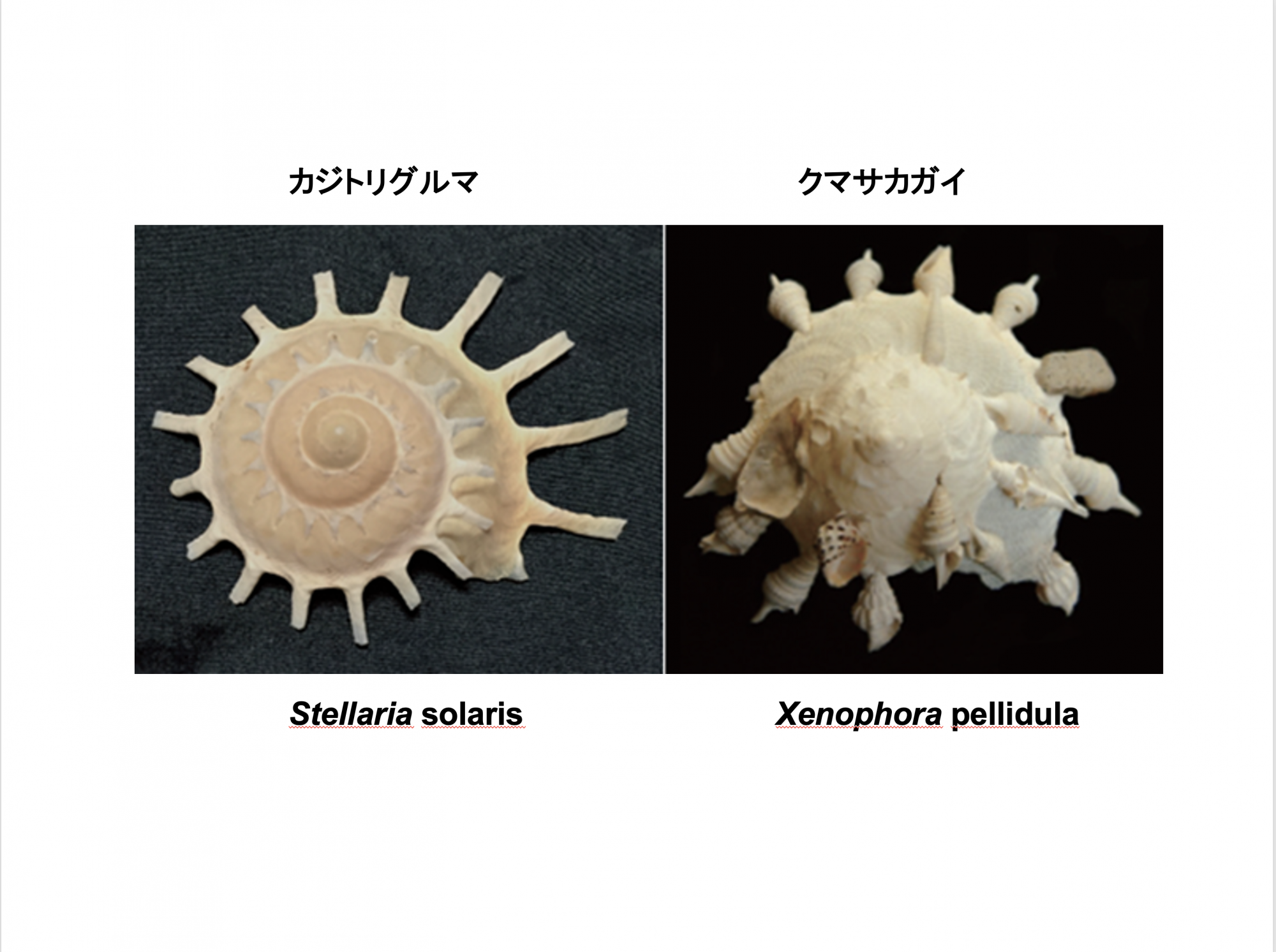 面白い例をご紹介します。カジトリグルマとクマサカガイです。似たようなトゲのあるシルエットですが、クマサカガイの方はただのトゲではなく、別の小さな貝がくっついています。