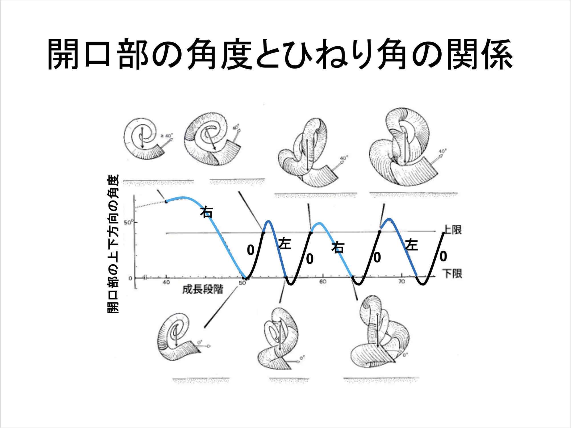 みなさんは、異常巻きアンモナイトというアンモナイトはご存知でしょうか?アンモナイトというと、ひねりのない貝殻を持つものが一般的ですが、異常巻きアンモナイトはこんがらがったような貝殻を持ちます。あまりにも複雑な形なので、見つかった当初はただぐちゃぐちゃに巻かれているのだと思われていました。しかしその後、何個も同じ形の貝殻が見つかったので、これはちゃんと規則性があるということがわかりました。そのルールを調べてみるとひねりの規則性が見えてきました。右にひねって、左にひねって、また右にひねって……これを交互に繰り返しながら巻いていくと、正確にあの形になります。そして、そのひねりを行ったことで、海中を泳ぐ時に体の水平のバランスがうまくキープできるのです。ここから体の成長に合わせてひねりのパラメーターをいじっているということがわかりました。この研究も岡本隆先生によるものです。