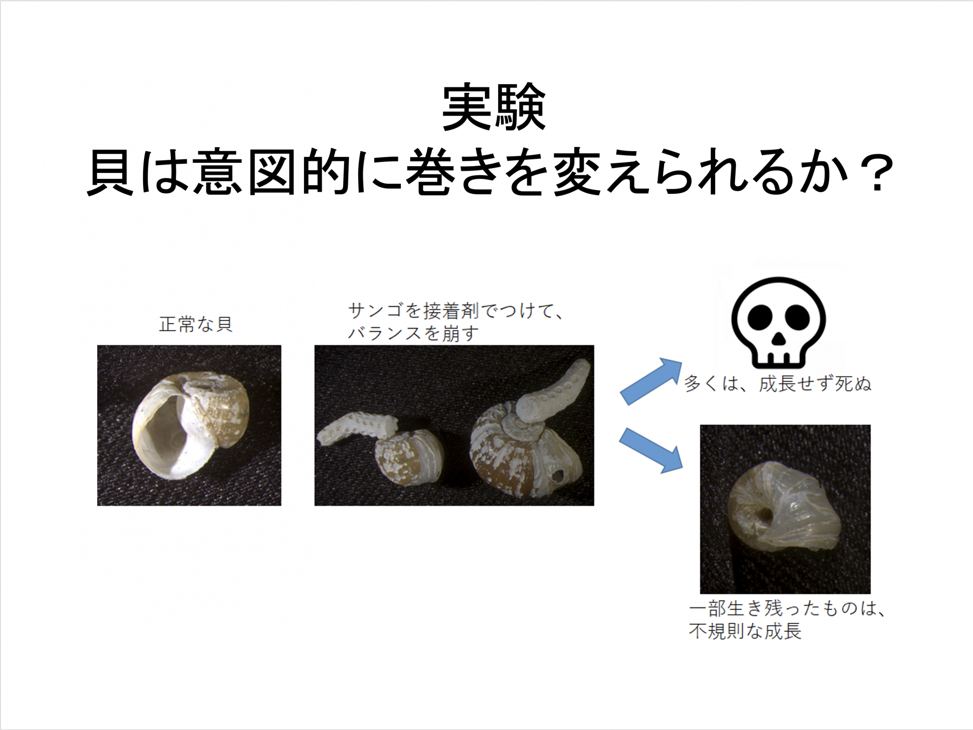 正常な貝に無理やりサンゴをくっつけて、強制的に殻の重心をずらしました。バランスを崩した貝の多くは死んでしまいましたが、一部生き残ったものもいます。
