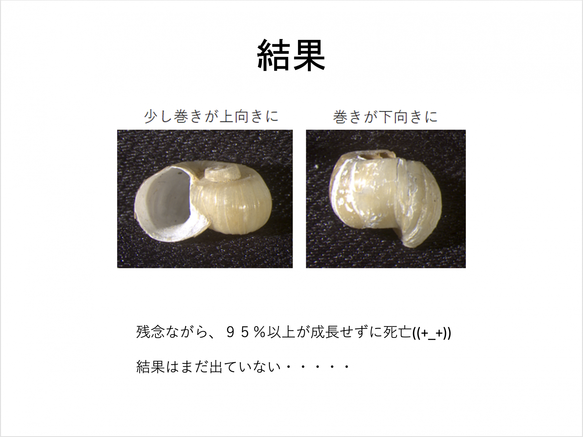 それらの貝殻を観察してみると、巻きが上向きになっていたり、下向きになっていたり、変な角度になっていました。まだデータが少ししか無いので、結果は出せませんが、やはり意図して貝殻を形成していそうですよね。