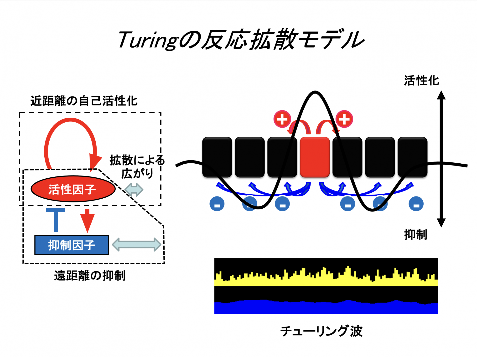 こうして並べてみると、そっくりですよね。だから模様も体の中で波のような現象が起きているのかもしれない、という仮説です。この仮説はアラン・チューリングという天才数学者が約70年前に書いた難しい論文によるものです。二種類の化学分子が互いに干渉しながら作ったり壊したりする時、ある条件下で波ができると、チューリングは考えました。この反応による波のことを、「チューリング波」と言います。