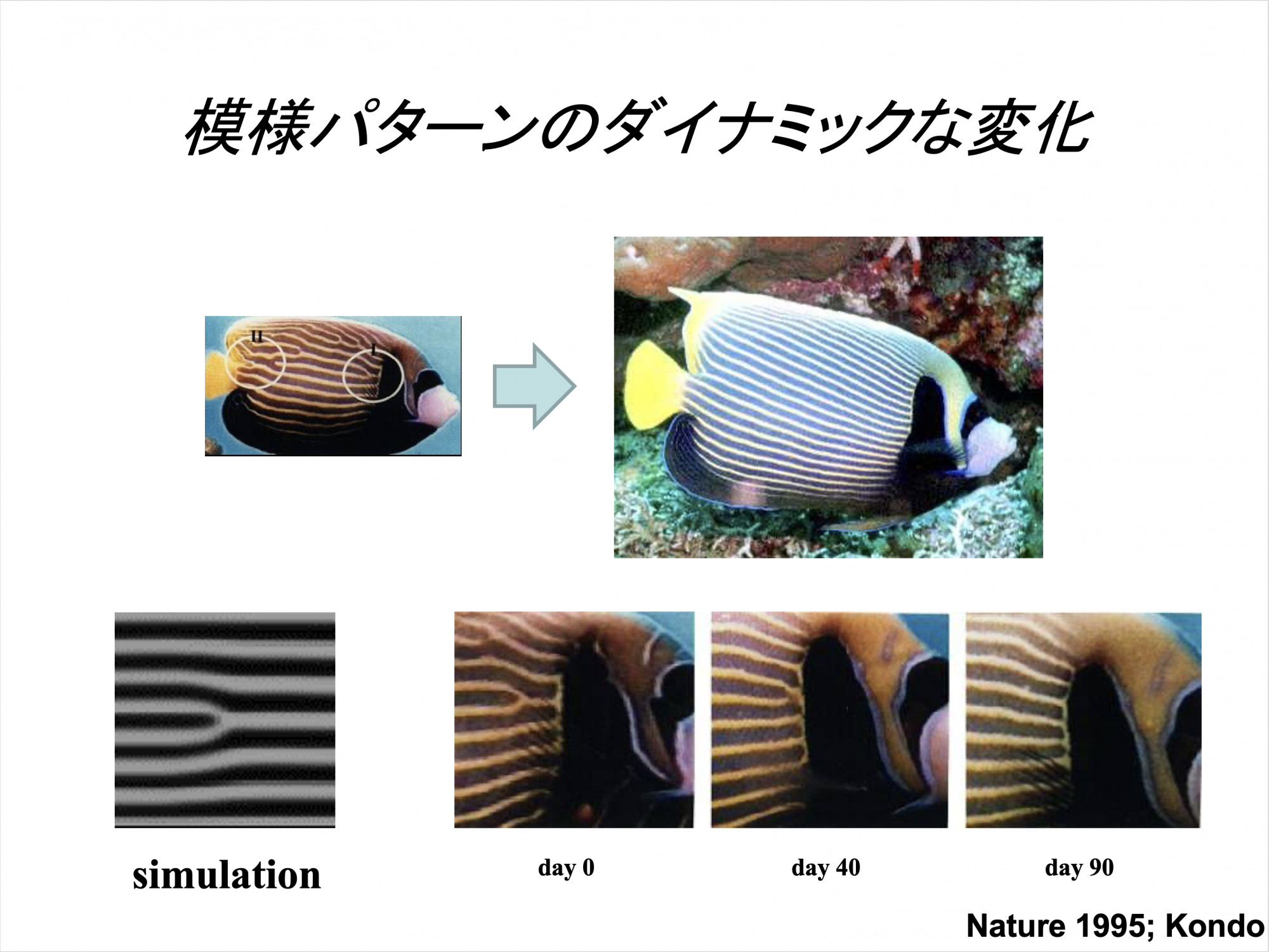 タテジマキンチャクダイという魚の模様を見ているうちに、模様の変化に気がつきました。小さい時には縞模様に枝分かれがあるけれど、大人になると無くなります。それに気がついた時に「あ、やっぱり模様は動いているな」と思いました。
