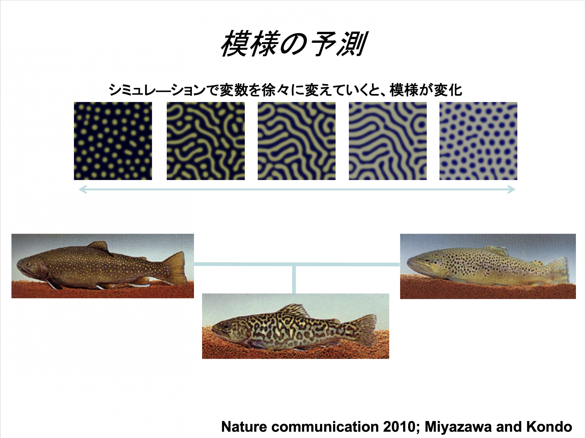 また、シミュレーションによって、暗い斑点と明るい斑点は中間に迷路模様を挟んでこのようにグラデーションしていることがわかりました。それが本当なのか、同じ魚で模様が暗い斑点のものと明るい斑点のものを掛け合わせてみると、予測通りに迷路模様の子供が産まれました。