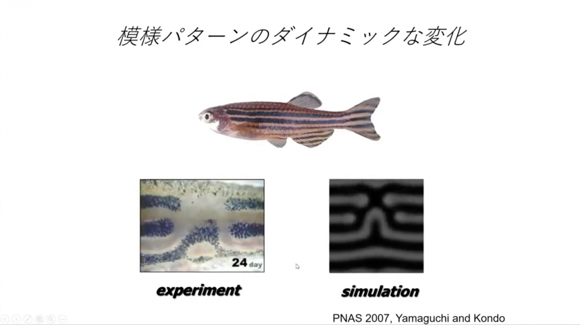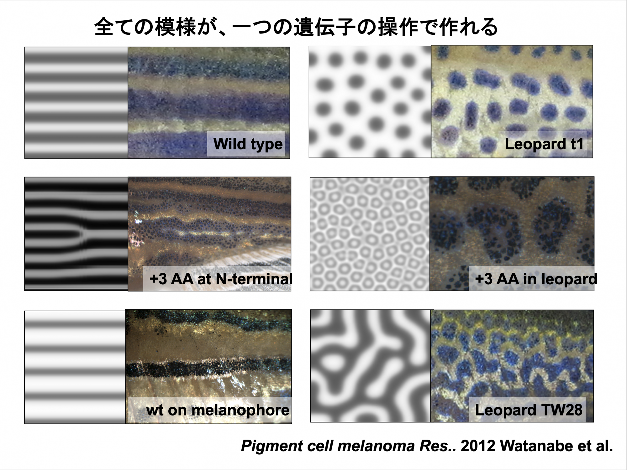 このように、ありとあらゆる模様の予測ができましたが、その後は15年ほどかけて様々な実験を泥臭く行いました。僕のところのラボメンバーに力を尽くしてもらって、最終的に模様を作る分子的な原理の発見に至りました。そのおかげでゼブラフィッシュの黄色と黒色の色素細胞がチューリングの言っていた分子の波を生む関係と一致していることが解明できました。