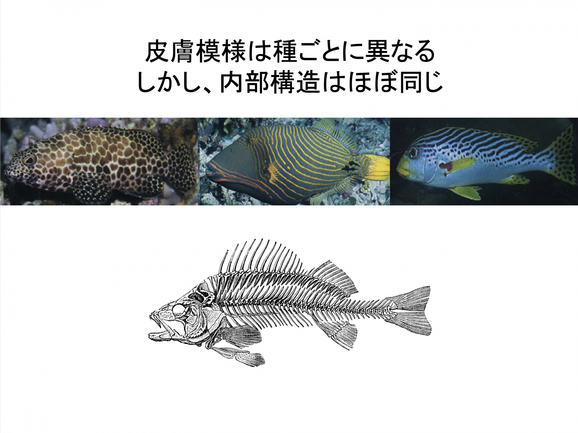 熱帯魚は派手な模様を持つイメージがありますよね。近縁種の魚でそれぞれ違った派手な模様を持っていても、体の構造を見てみると骨の形や内臓などの体の仕組みにはあまり差がなく、大体同じようなものです。