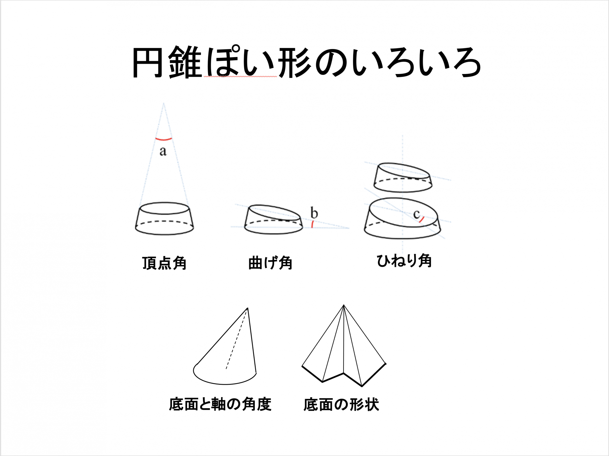 フチを伸ばすときに、たくさん伸ばす部分とちょっとしか伸ばさない部分を作る。すると少し傾きます。さらに、伸びる角度を少し捻ることもできます。他にも軸の角度を変えたり、底面の形状を変えることもできます。ここは頭の中で考えるのは難しい部分ですね。でもこの5つが円錐っぽい形で体の形を変えずに大きくできる変異のパターンです。