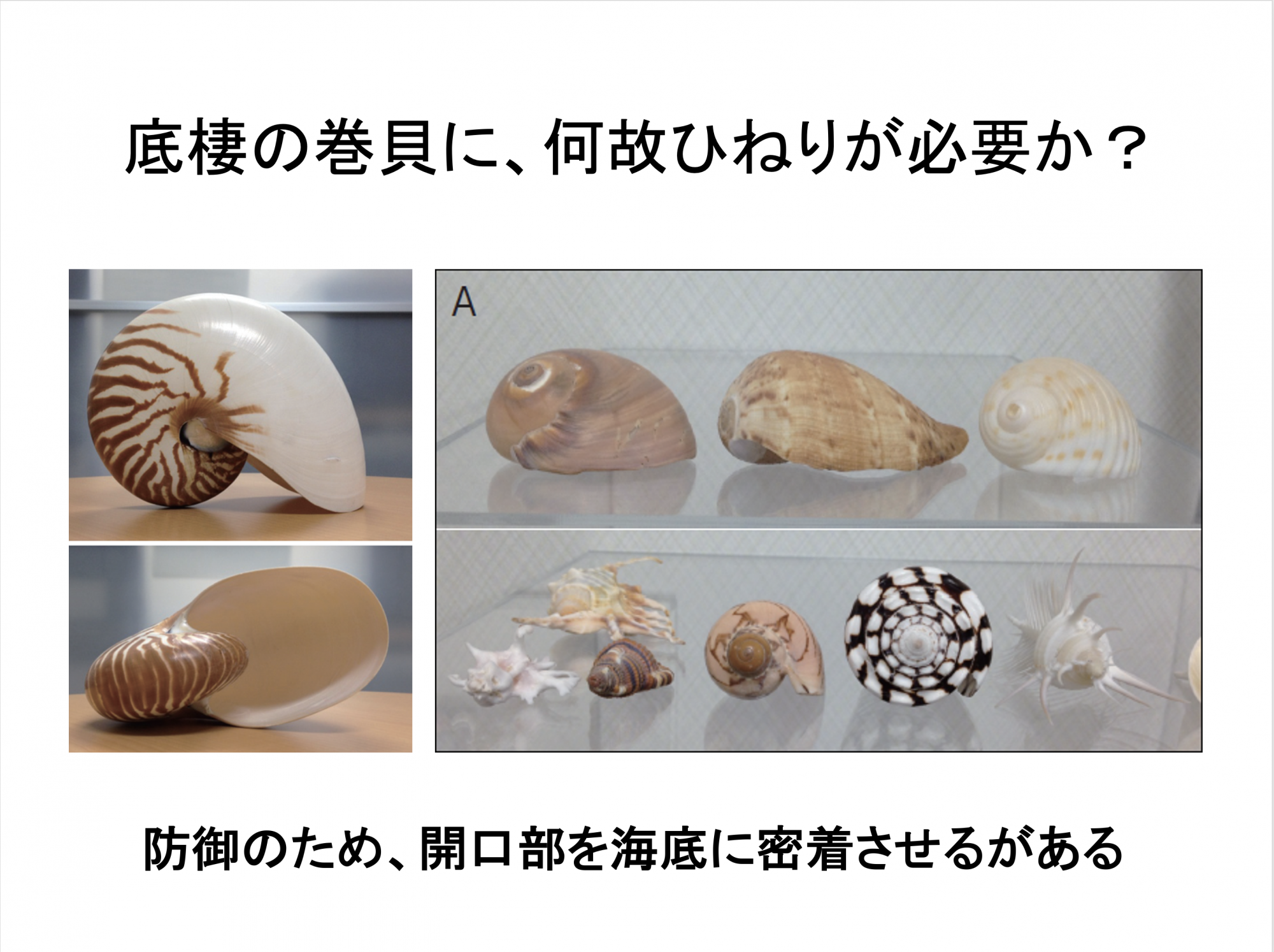 巻貝というのは海の底や岩場にくっついて生活しています。オウムガイの殻を机に置いてみると、どう工夫しても必ず殻と机の間に隙間ができてしまいます。貝殻というのは外敵から身を守るために必要なものなので、隙間があると困るわけです。オウムガイ自身は泳いで逃げられるから困りません。でも這って進む貝は足が遅いので襲われてしまったら逃げられない。