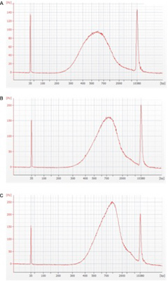 また、切断反応の温度を下げることでもインサートサイズが変化するが、作成したライブラリーのピークパターンがブロード(幅広)になる傾向が強い(図1C)。様々な長さのリードが混在することで、アセンブルの効率が上がる可能性にも期待できるため、実験の目的に合わせて使い分けることでMiSeqをより有効に活用できると考えられる。