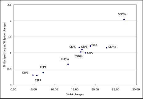 さらに、11組のペアを作ったCSPについて、ペアのCSPの間にどのような塩基置換が生じているのか解析した。すると、同義置換の割合はペア間でほぼ一定(5~10%)に保たれているのに対して、非同義置換(アミノ酸置換につながる塩基置換)の割合は5~27%まで多様性があった。この違いは、『非同義置換と同義置換の比』をとることで、より明確になる(図6)。CSP1,2,4は非同義置換の割合が小さく、ナミアゲハとシロオビアゲハでよく保存されているといえる。逆にCSP8bは、非同義置換の割合が大きい。