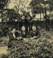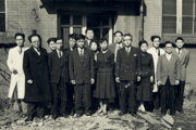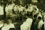 五号館クラブでアジア留学生と工場訪問(1955年)。(本人:奥列右から四人目)。