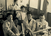 大学三年生の時、同級生と化学科の実験室で(本人:中央奥)。