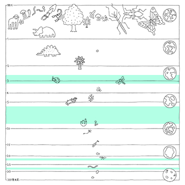 多様な生きものが長い時間の中で誕生した歴史と関係を表現している。