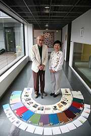 岡田先生と館長室の前で。この時のカーディガンはBRHを始める時に岡田先生からいただいた昆虫柄のもの。(季刊「生命誌」50号対談)