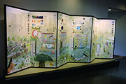 展示ホール1Fには織物の「生命誌マンダラ」がある。電子ジャカード織りで、縦に白、黒2色の糸を約7千本、横に白、黒、青、緑、黄、赤6色の糸を約1万8千本織り、糸が交叉する約1億3千万個の点によって描かれている。