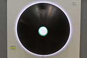 BRHの1階で展示している崔さんの作品「瞬・生」。遠くから見ると、光の輪を伴った漆黒の円に見えるが、近くで丸い穴を覗き込むと一匹のチョウが浮かび上がる。チョウの後ろには細胞の顕微鏡写真があり、生命の内と外との関係を考える作品だ。
