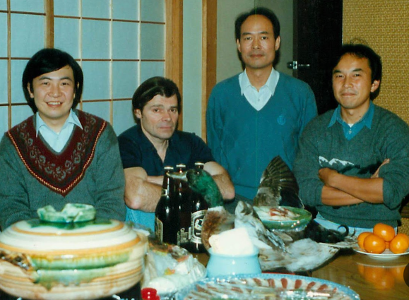 姫路工業大学の理学部新設時のメンバー。(右から本人、渡辺憲二教授、Prof. Volker Schmid、織井秀文助手)