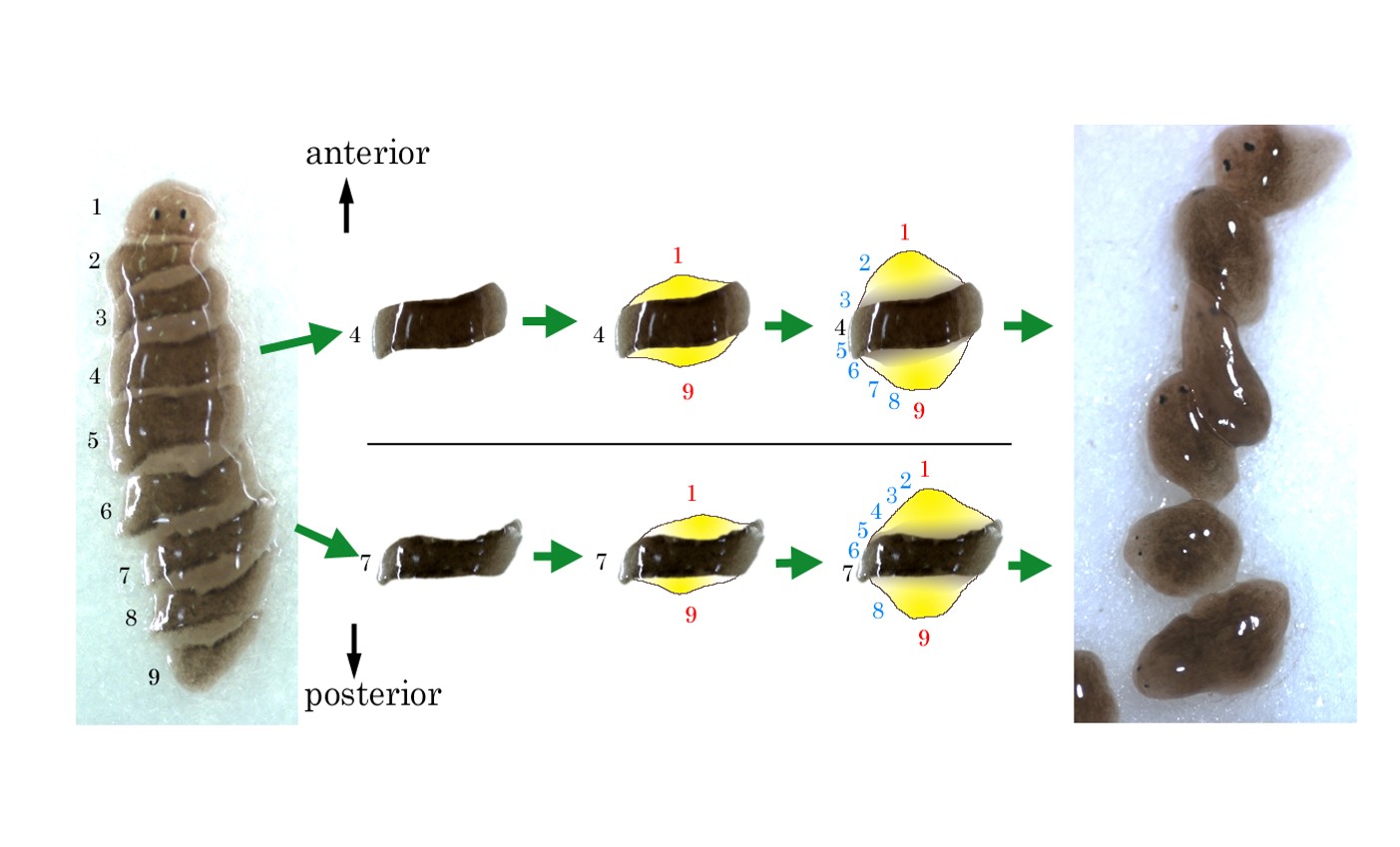 姫路工業大学では、世界で初めて実験室で増やすことに成功した、GIというプラナリア株を使いました。渡辺さんが岐阜の入間川で採ってきた1匹から無性生殖(fission: 分裂)によって増やしたものです。私たちは、プラナリアのさまざまな細胞の分子マーカーをとっては、「細胞の社会」というコンセプトで、プラナリアの再生を細胞レベルで詳細に観察したのです。プラナリアにはある一定の大きさになったら自分で分裂して増え、また、10個に切ったら10匹になるという性質があります。プラナリアでもイモリと同じように細胞の分化転換能力があることで高い再生能力が発揮されるに違いないと渡辺・阿形の二人とも思ってプラナリアの再生研究をしていたのですが、どんなに分子マーカーを用いても分化転換は観察されませんでした。古くから、プラナリアは成体になっても、あらゆる種類の細胞になれる多能性幹細胞(neoblastと呼ばれる)を持っていることで高い再生能を保持していると考えられてきたのですが、結局、多能性の幹細胞を細胞選別装置(FACS)で精製することに成功し分子マーカーを取得したことで、われわれは分化転換屋さんから幹細胞屋さんへとシフトすることになります。そして、山中伸弥さんがiPS細胞(成体の分化細胞を幹細胞へリプログラミングした細胞)を作ったことで、人々はプラナリアが多能性幹細胞を使って切ったところからどうやって必要な場所に必要なものをつくるのかに着目するようになります。そして、われわれは「体の個々の細胞には番地みたいなものが付いていて、異なる番地の細胞が接すると途中の番地を埋めるように多能性幹細胞が反応することで再生が起きる」、すなわち、プラナリアは失われた部分のうち、まず先っぽの番地の細胞を作ることで、残っている細胞との間を埋めるように再生していくことを見出します。個体という多細胞生物の「細胞の社会」はこの座標のようなシステムによってコントロールされていることをプラナリアの再生研究から示すことができました。