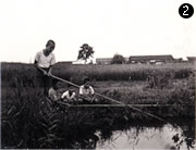 近くの池でフナ釣りもした。写真奥に見える松の木には、スズメがたくさん巣をつくっていた。