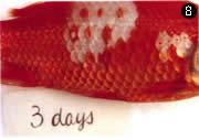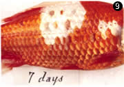 そこで、薬に頼るのではなく、ワクチンを開発し免疫の力を使って対応できないかと考えました。魚の免疫研究は、まだほとんどやられていなかったので、まず研究の方法から考えなければなりません。臓器移植のときに起こる拒絶反応をヒントに、観察方法をいろいろ考えた末、鱗はどうだろうと思いつきました。これなら、手術が簡単です。1枚抜いて他の個体に入れるだけですから。しかも拒絶の様子を外側から連続的に実体顕微鏡で観察できます。この方法を金魚に試してみたところ、自分の鱗は例外なく活着し、他の金魚から移植した鱗は、赤い色がだんだん色褪せてついには消えてしまいました。同じ両親から生まれた兄弟間でもことごとく拒絶され、金魚にも免疫の能力があることが見事にわかりました。
